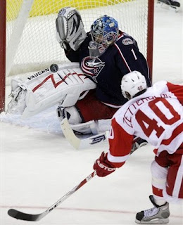 If you read our blog, you know that we have invented our own little universe in which John Curry of the Wilkes-Barre/Scranton Penguins is God. We worship goaltenders. If John Curry is God then Steve Mason is Jesus Christ. We're still reeling from the photo shown above, in which he stones Henrik Zetterberg like an honest-to-god PIMP. No goaltender in the league has a more promising future, and no goaltender has come along in a looooooooong time with that amount of raw talent, skill, intelligence, and athleticism. Plus, we have an ongoing love affair with everyone who wears a Blue Jackets uniform. (Even R.J. Umberger a little bit, the slimy bastard.) Mason is glorious. Better than any of your false idols. It's called blasphemy, everyone. BLASPHEMY.